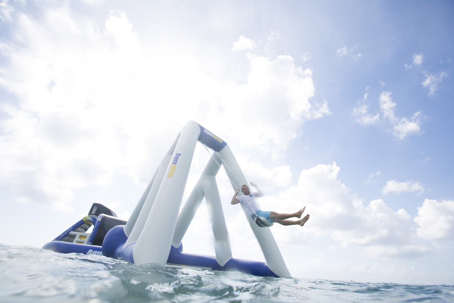 The Catapult provides an exciting new way for users to swing or launch themselves over the water. Features an integrated swim platform and lounging area on the inside that is easy to board from the water and allows it to be used as a stand-alone unit. The HP inflatable seat design is comfortable and prevents any unnecessary bumps and bruises. Molded climbing steps on the inside and outside make it easy to climb onto the swing position. It can be used as a stand-alone item, or can be connected to any Aquapark using the 5 D-Ring Interloc system on all 3 sides combined with our secure Vario-Lock cinch strap system.