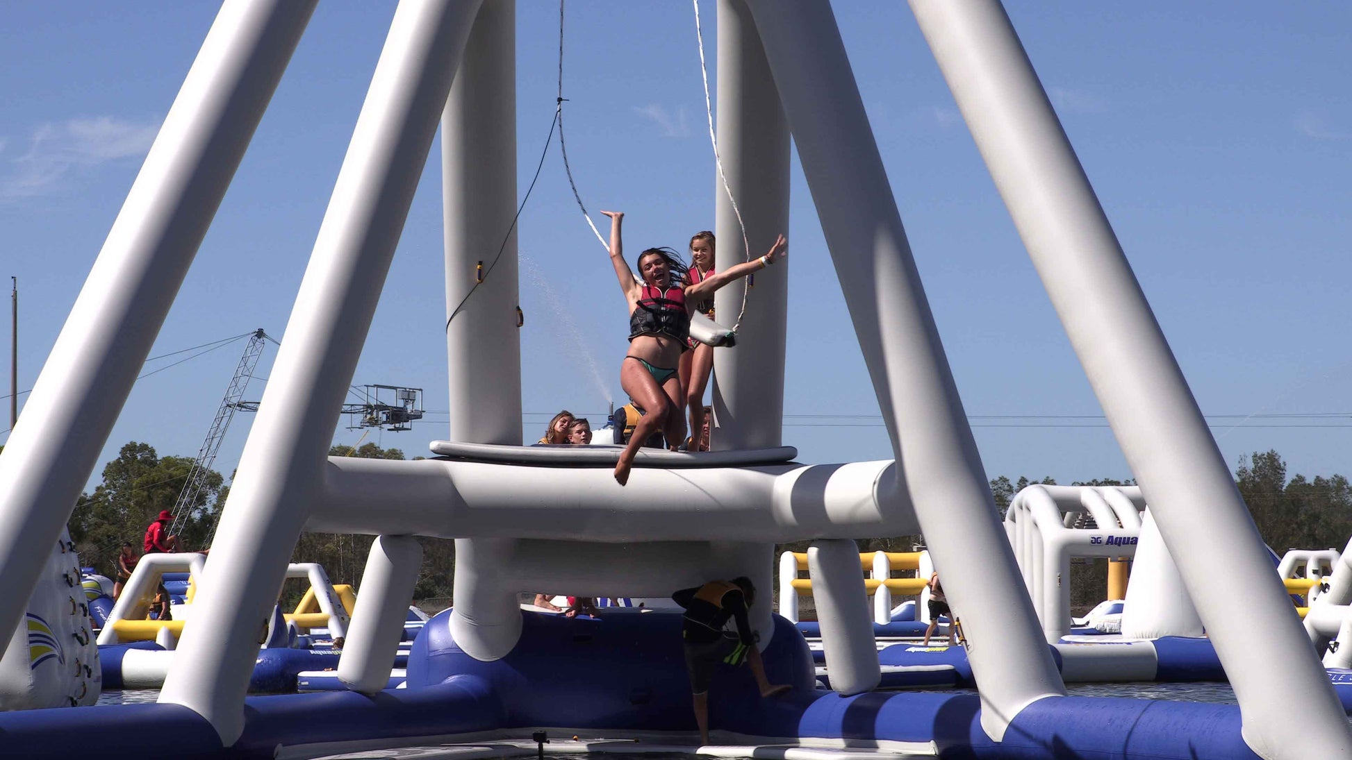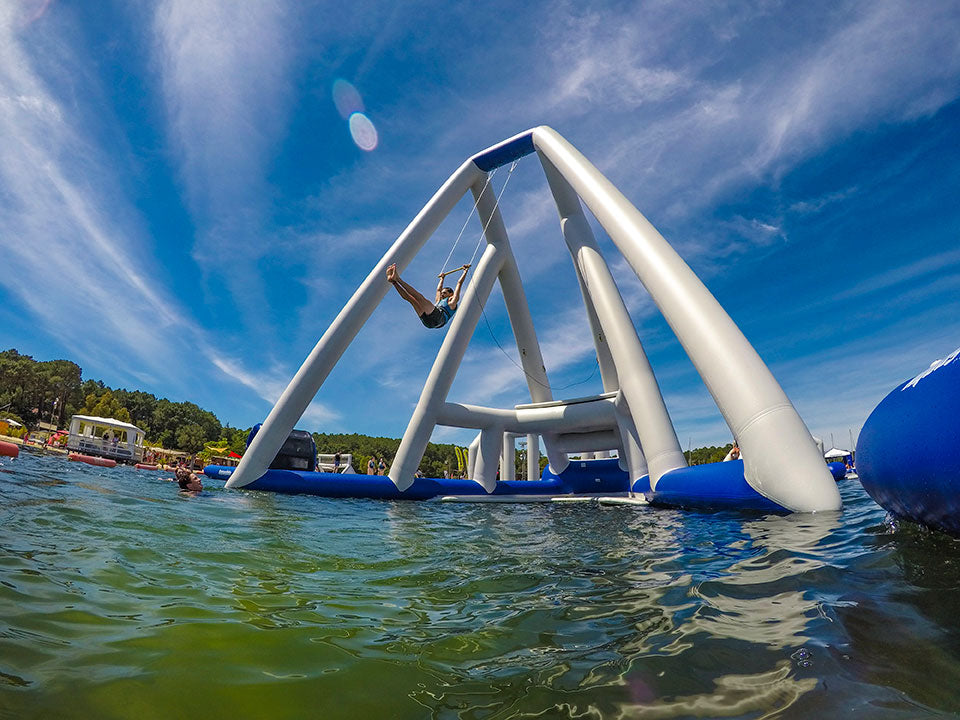 A humongous swing that launches you into a new dimension of water play for hours of high flying fun The Skyrocket provides an exciting new way for users to swing or launch themselves over the water. Features an integrated swim platform and lounging area on the inside that is easy to board from the water. Climbing handles on the inside and outside make it easy to climb onto the swing position. It can be used as a stand-alone item, or can be connected to any Aquapark on one side.